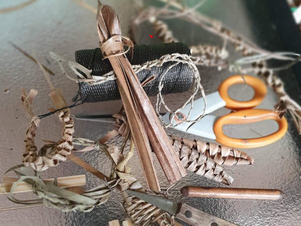 A dozen seemed worth investigating: Monkey Vine, Bulrush, Sedges, two palms, Pandanus, Lomandra, Milla Millaa Vine, twigs from nearby Eucalypts, Frogmouth, Native Wisteria, Scrambling Lily, Dianella, Cordyline and an unknown wiry climber.