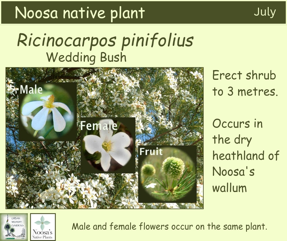 The wedding bush is also flowering now, heralding the spring wildflowers in the wallum. Planning specific dates for wildflower walks has always been fraught with the uncertainty of an early or late flowering season. But this is restricted to just a couple of weeks as the heathland around Noosa rolls out its beauties. So walkers will be sure to enjoy either early or later displays.