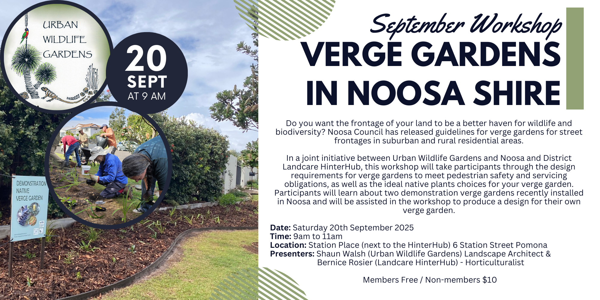 In a joint initiative between Urban Wildlife Gardens and Noosa and District Landcare HinterHub, this workshop will take participants through the design requirements for verge gardens to meet pedestrian safety and servicing obligations, as well as the ideal native plants choices for your verge garden. Participants will learn about two demonstration verge gardens recently installed in Noosa and will be assisted in the workshop to produce a design for their own verge garden.