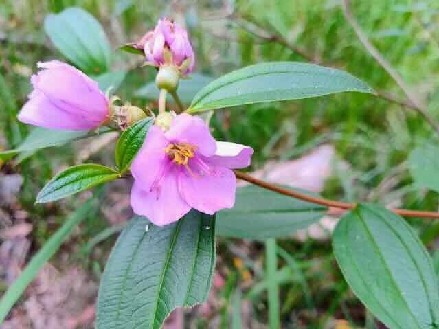 Melastoma malabathricum, (Blue Tongue / Native Lasiandra – small bushy shrub to 2 metres), has large pink – mauve flowers throughout the year and edible blue – black fruit. It attracts birds, bees and butterflies such as Hypochrysops miskini (Miskin Jewel Butterfly) and provides bush tucker.