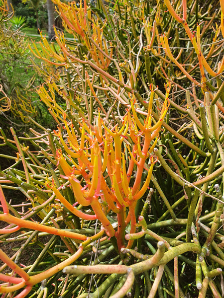 Recently I have noticed the desert plant Euphorbia tirucalli becoming more popular in gardens on the Sunshine coast. It’s not hard to see why, with the orange tips and cactus type foliage, its very attractive and brightens up any sized garden.